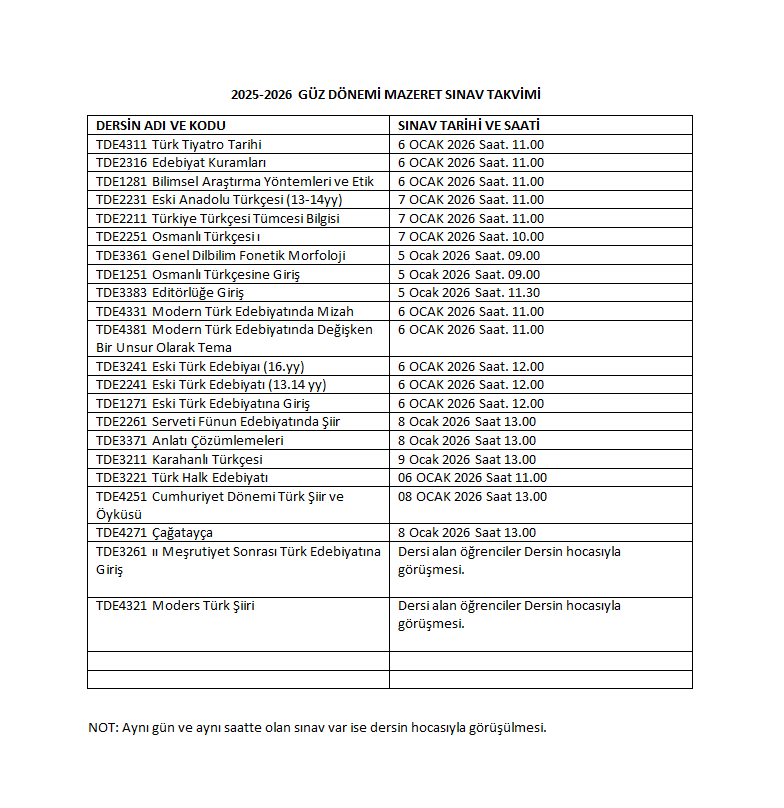 Not: Çakışan sınavlar olması durumunda dersin öğretim üyesi ile görüşülmesi gerekmektedir.