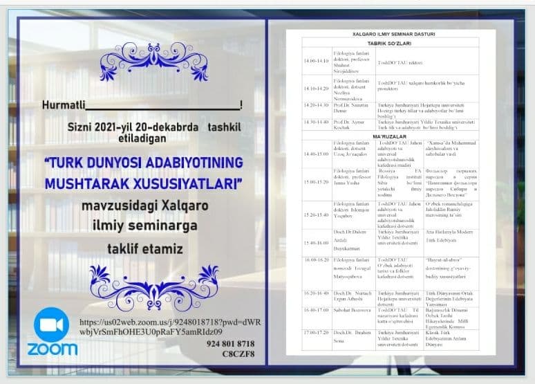 Uluslararası işbirlikleri çerçevesinde 20 Aralık 2021 Pazartesi günü hocalarımız Prof. Dr. Aynur Koçak, Doç. Dr. Didem A. Büyükarman ve Doç. Dr. İbrahim Sona, Taşkent Özbek Dili ve Edebiyatı Üniversitesi'nde seminer dersleri veriyor.