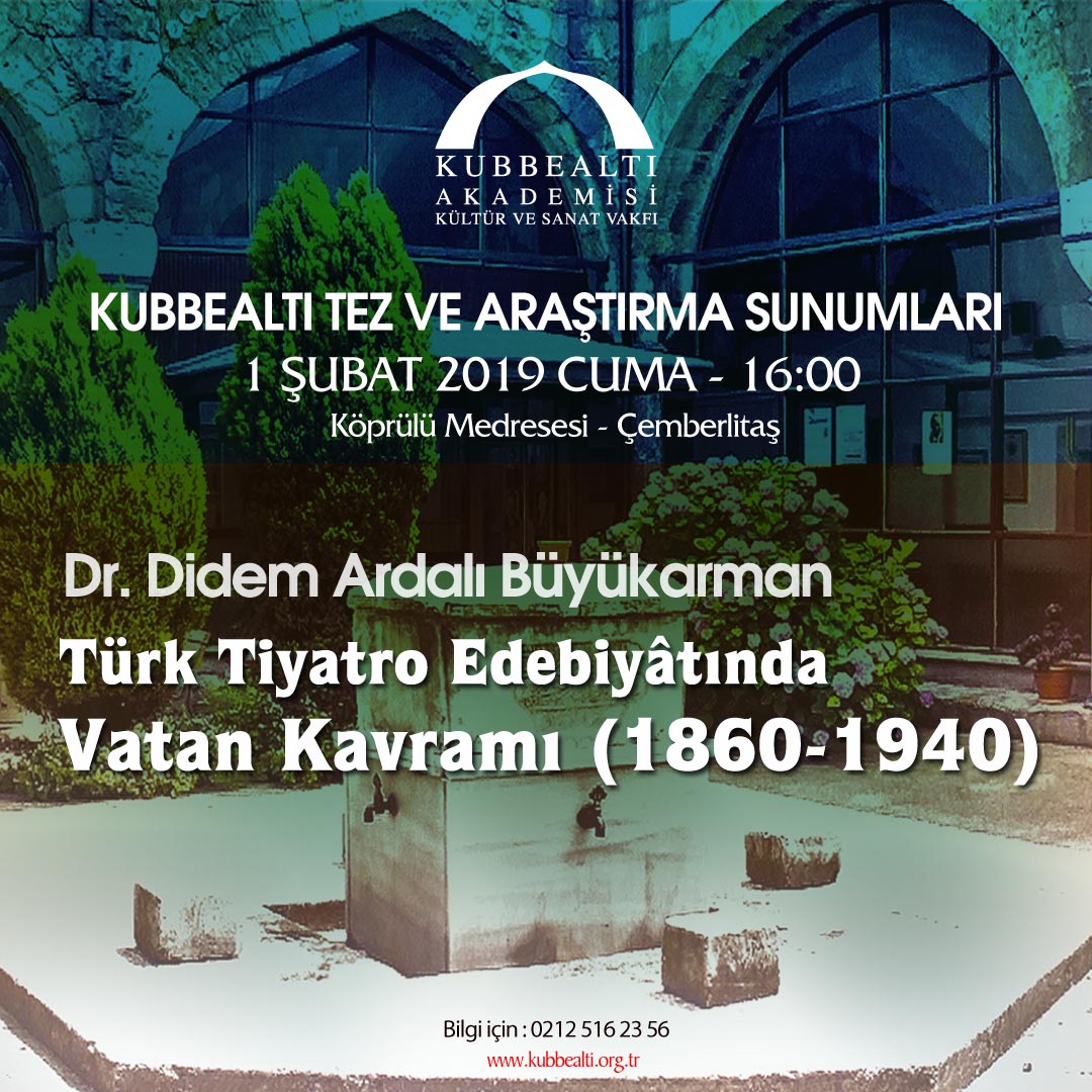 Bölümümüz öğretim üyelerinden Dr. Öğretim Üyesi Didem ARDALI BÜYÜKARMAN, 1 Şubat 2019 tarihinde Kubbealtı Akademisi Kültür ve Sanat Vakfı'nda "Türk Tiyatro Edebiyatında Vatan Kavramı" konulu bir konuşma yapacaktır.