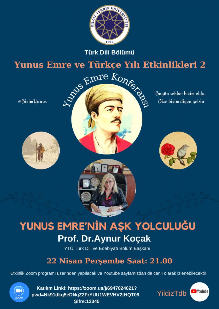 Yunus Emre ve Türkçe Yılı Etkinlikleri kapsamında Yıldız Teknik Üniversitesi Türk Dili bölümü tarafından Yunus Emre’nin Aşk Yolculuğu konulu konferans düzenlenecektir. Konferans bölüm başkanımız Prof. Dr. Aynur Koçak'ın konuşmacı olarak katılımıyla online olarak 22 Nisan Perşembe günü saat 21:00'da gerçekleştirilecektir.